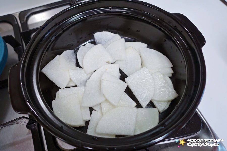 * 무맛이 빨리 우러나오게 얇게 썰어주시고요.