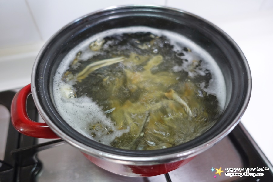 ▣ 멸치육수 : 멸치의 내장을 제거한 후 => 몸통과 머리만 남겨주세요 => 약불에 달구어진 냄비에 멸치몸통과 머리를 살짝 볶은 후 => 물 1000ml를 넣고 끓여주세요 => 팔팔 끓기 시작하면 그대로 10분간 끓이다 => 건더기를 모두 건져주세요.