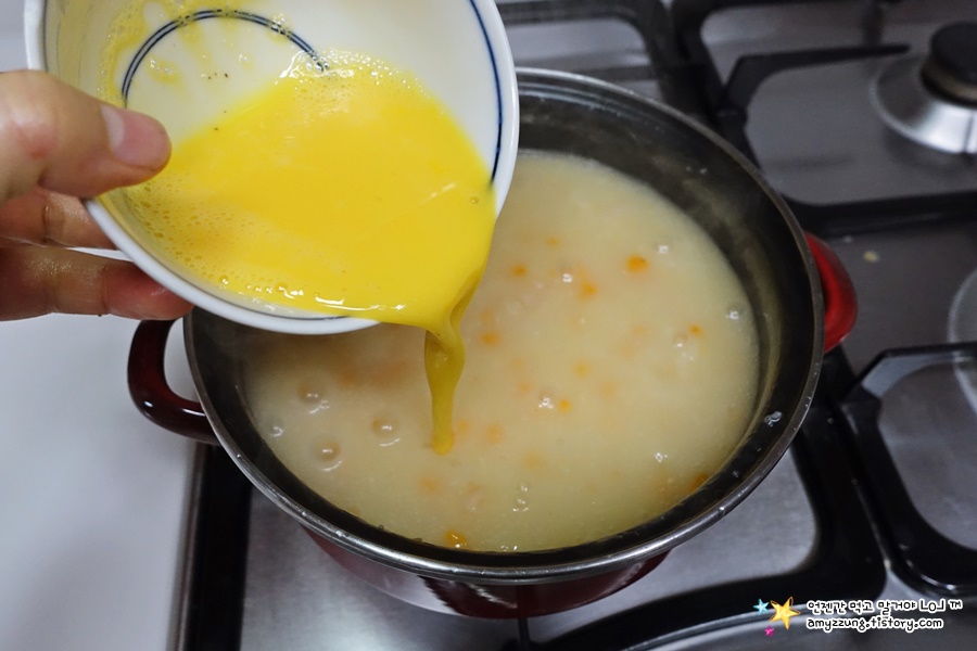 ▣ 일곱째 - 찹쌀이 푹 익었다면 => 달걀물을 넣고 => 주걱으로 골고루 섞어주세요.