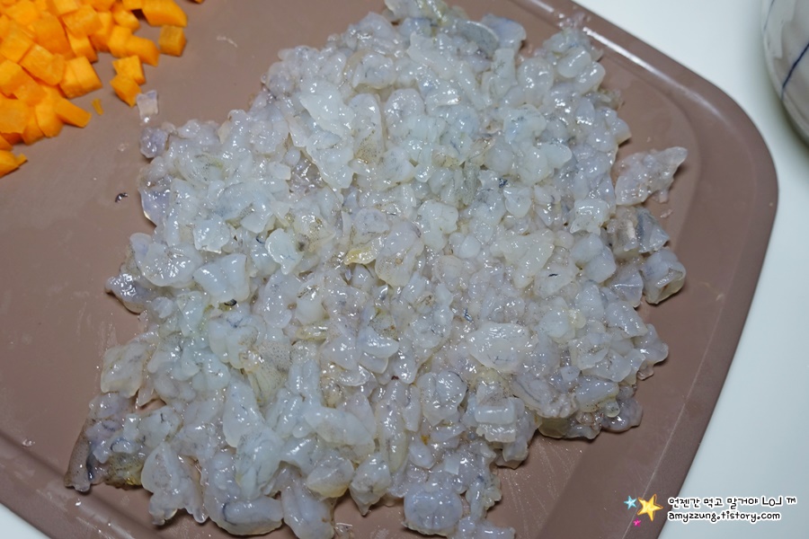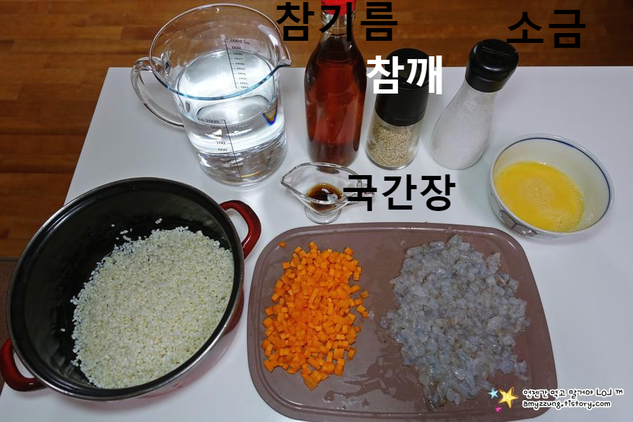 ▣ 주재료 : 찹쌀 (또는 맵쌀) 1종이컵, 새우살 1종이컵, 당근 5cm 한토막, 물 900ml
