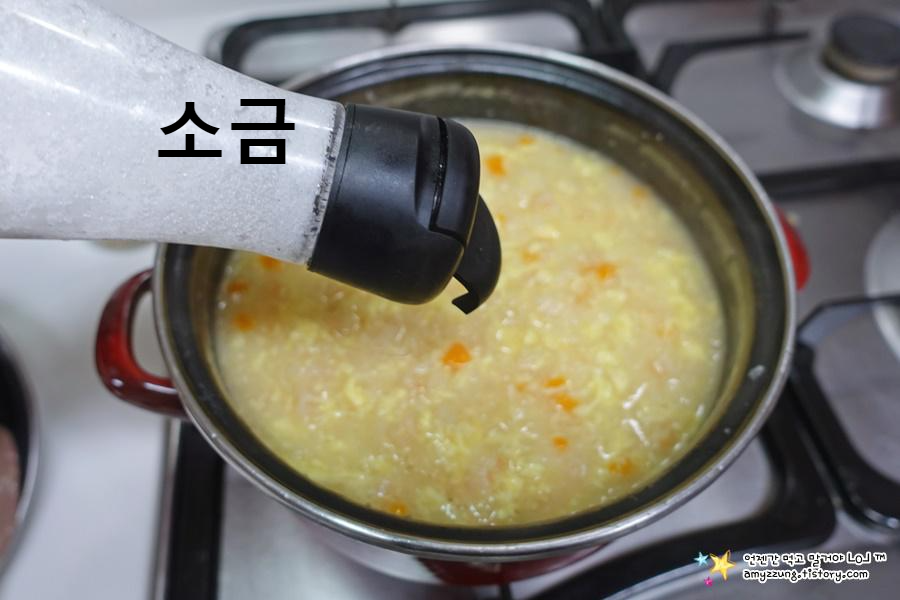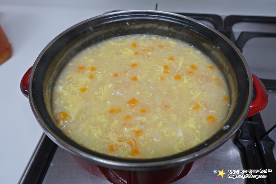 지난번에 만든 소고기야채죽보다는 댤걀과 새우가 더 부드럽고 가볍네요.