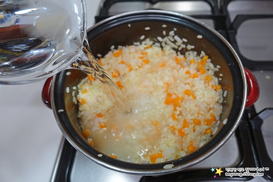 ▣ 셋째 - 찹쌀에 수분이 거의 다 날라갔다면 (눌러붙기 직전에) => 약불에서 새우살, 당근을 넣어 볶아주세요.