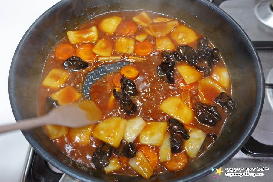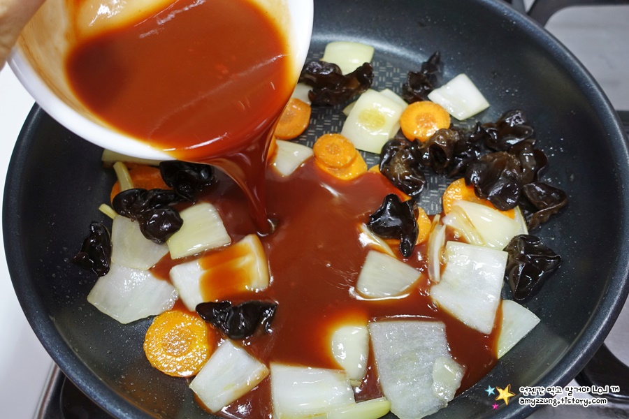 채소도 딱 옛날에 주로 넣었던 양파, 당근, 목이버섯만 넣었고요.