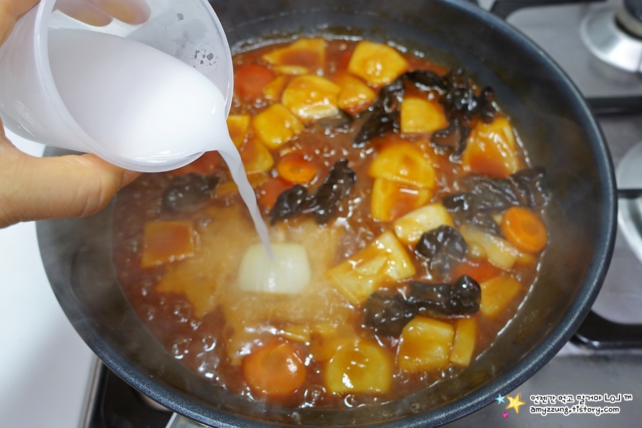 ▣ 여덟째 - 당근이 거의 익었다면 => 전분물을 붓고 => 주걱으로 재빨리 골고루 섞어주세요.