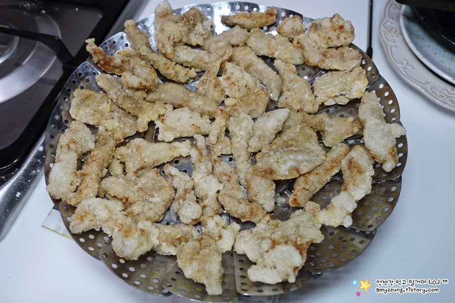 * 식용유의 양은 고기가 푹 잠길정도로 넉넉히 넣어야 바삭하면서 고기가 속까지 빨리 익습니다.