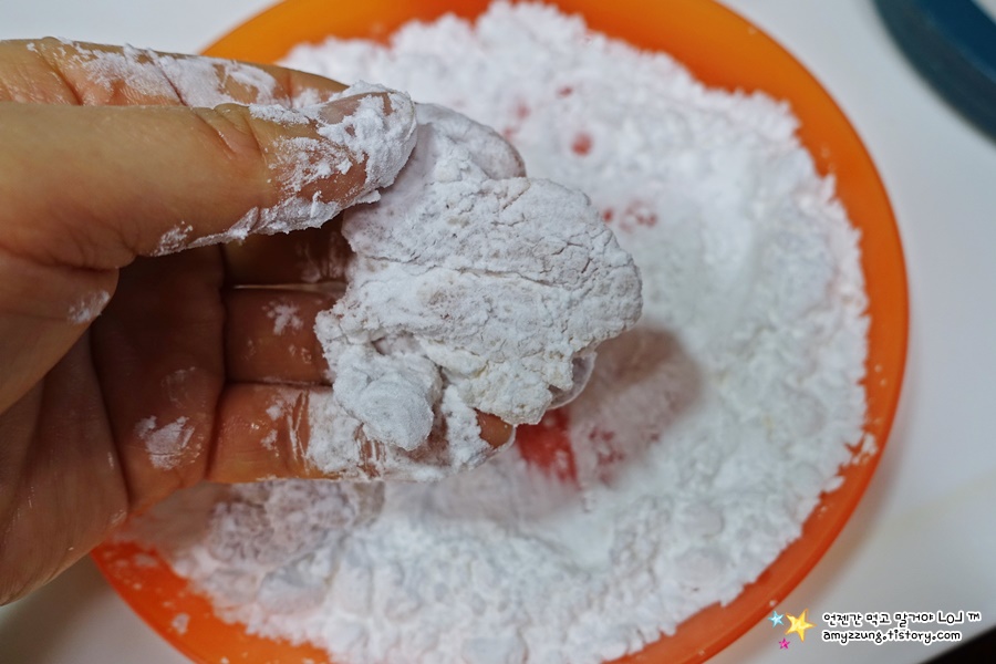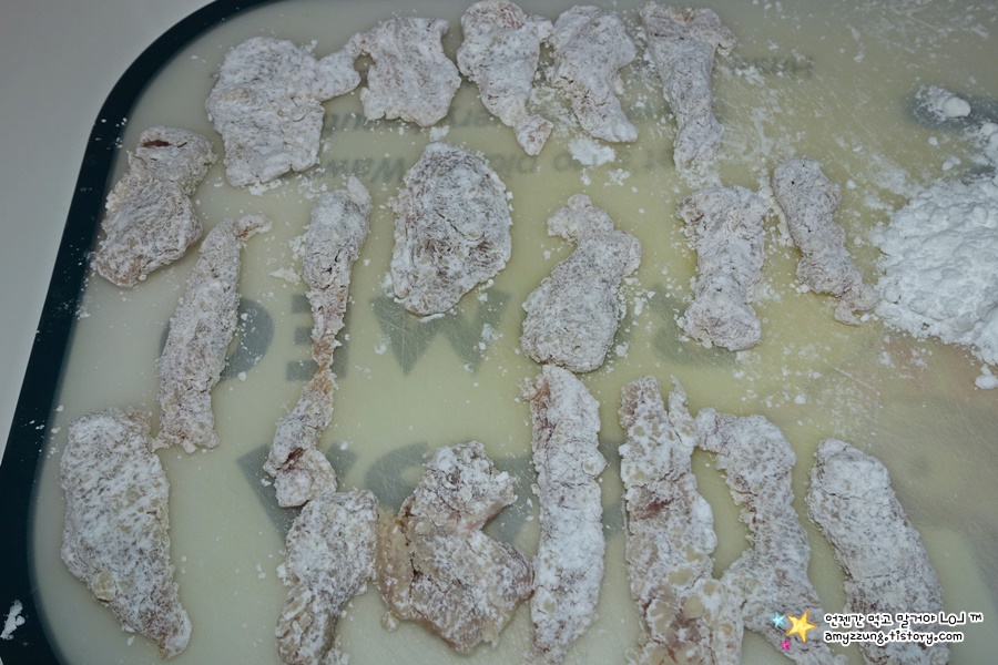 * 촉촉하게 밑간한 고기의 겉면 수분에 그대로 감자전분을 묻혀줄꺼에요.