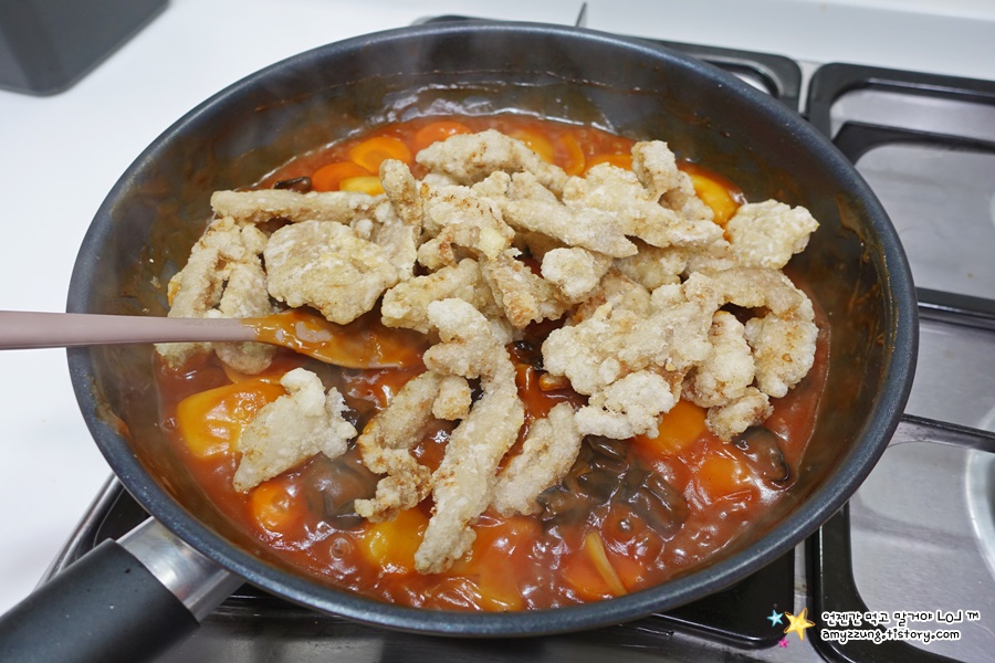 ▣ 아홉째 - 찍어먹는 다면 고기와 소스를 따로 그릇에 담고, 부워먹는 다면 소스에 튀긴 고기를 넣고 골고루 섞어주세요.