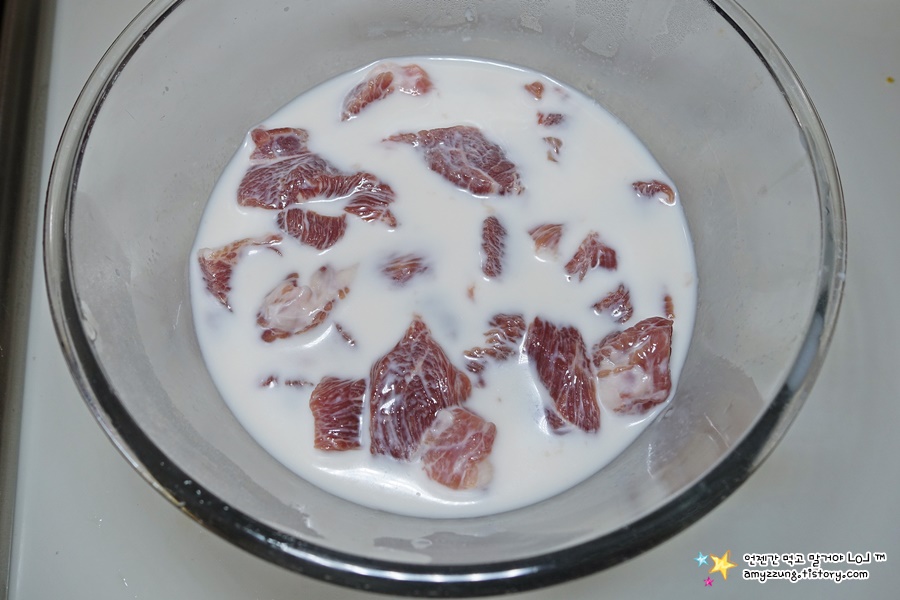 ▣ 잡내제거 : 고기를 흰우유에 1시간정도 담근 후 => 깨끗히 헹구고 물기를 탈탈 털어주세요.