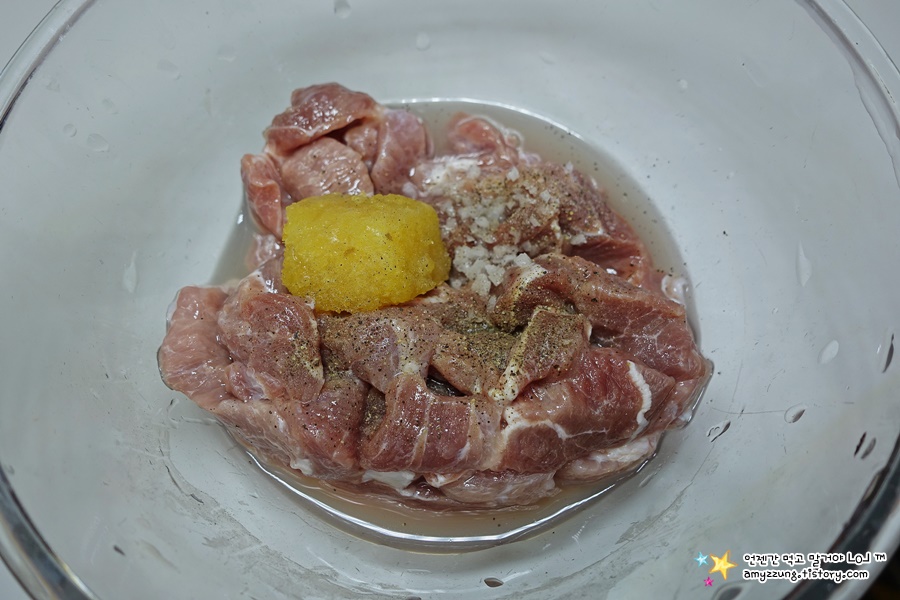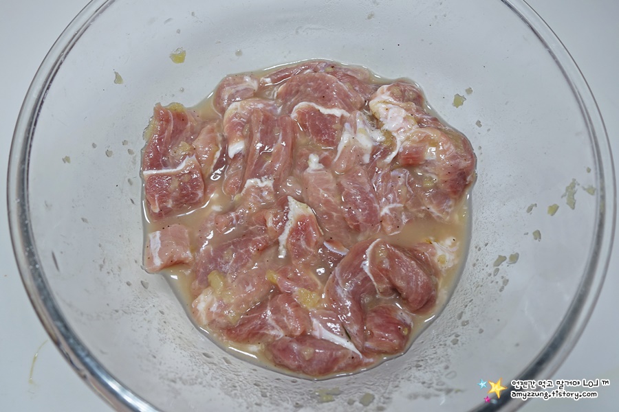 ▣ 돼지고기 밑간재료 (밥숟가락) : 다진 마늘 1/2, 소금 1/4, 후추 4꼬집, 소주1, 물 1