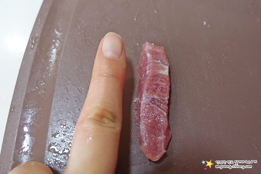▣ 고기 썰기 : 기름을 제거한 살코기만으로 성인여자 검지손가락 크기로 썰어주세요.