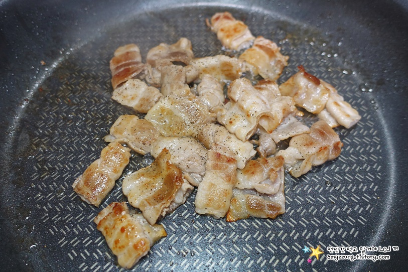 ▣ 첫째 - 중불에 달구어진 팬에 대패삼겹살을 굽다가 => 노릇해졌으면 후추 2꼬집을 뿌려준 후 불을 꺼주세요.