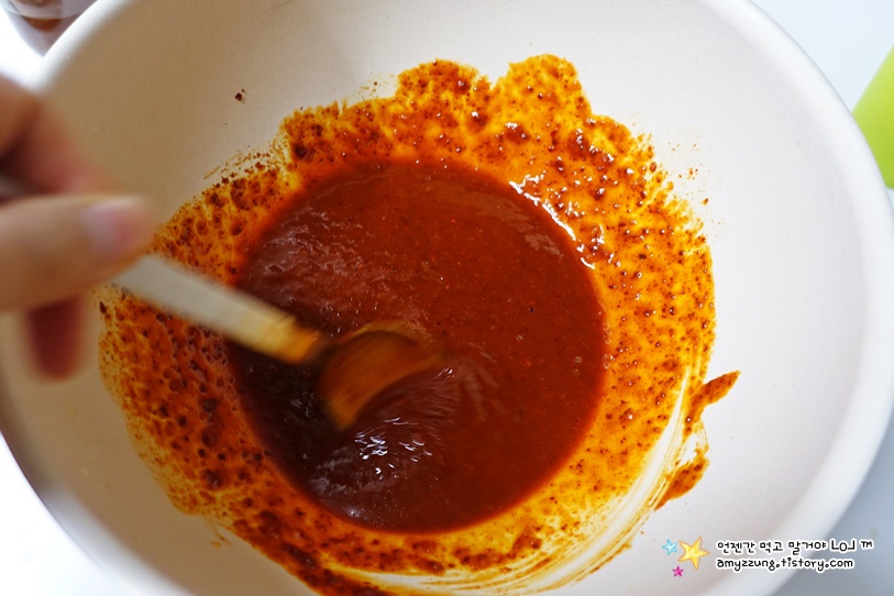 고추장의 비율을 낮추고 고춧가루와 간장을 섞었습니다.