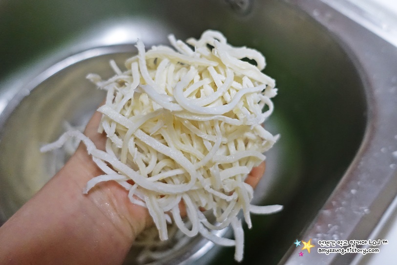 ▣ 진미채1 : 큰 양푼에 진미채와 충분히 담길정도의 물을 넣고 => 3분정도 불린후 => 1번만 더 헹궈주세요.