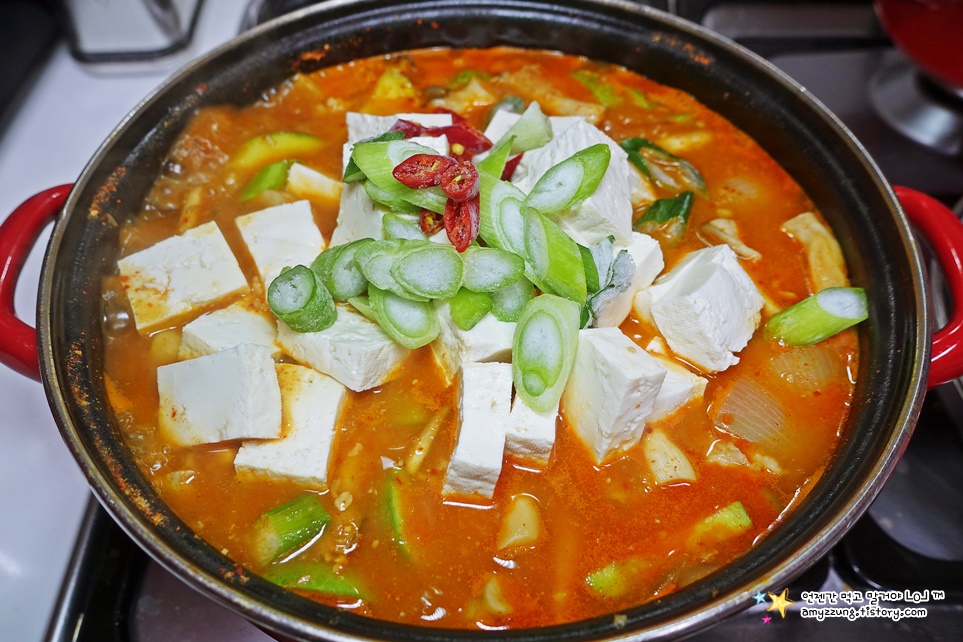 ▣ 여섯째 - 채소가 다 익었다면 => 두부, 대파, 청양고추를 넣고 => 4~5분간만 더 끓인 후 불을 꺼주세요.