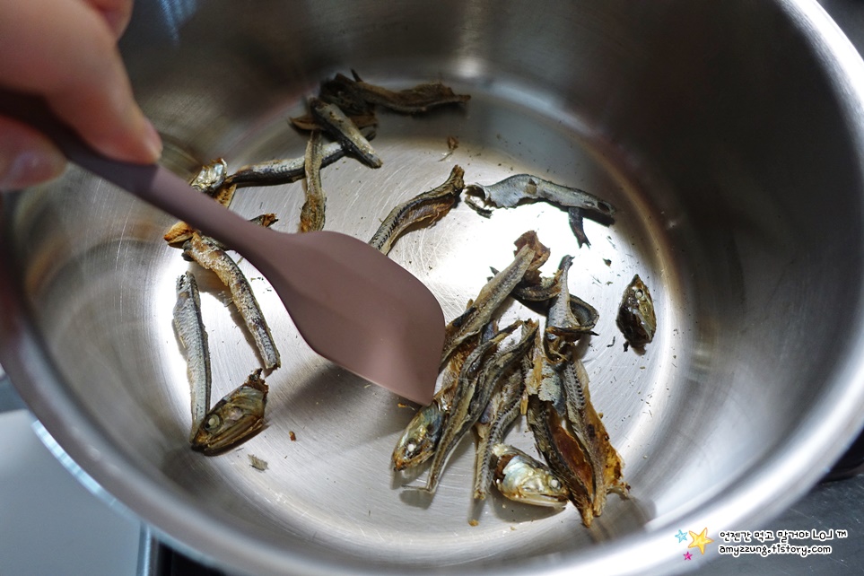 ▣ 멸치 : 쓴맛이 나는 내장은 떼어 버리고=> 몸통과 머리만 약불에 달구어진 냄비에 멸치는 2~3분간 짧게 볶아 주세요. (잡내를 날려주세요.)