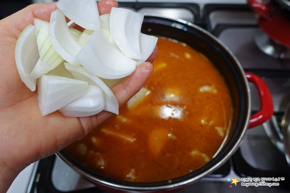 ▣ 셋째 - 바로 이어서 감자와 양파를 넣어 끓여주세요.