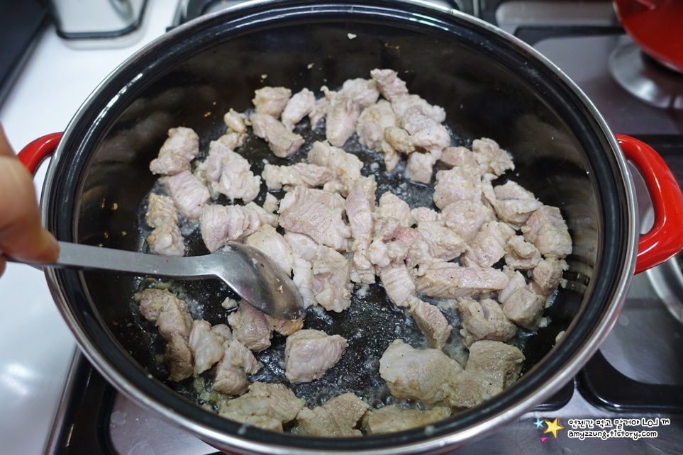 ▣ 첫째 - 중불에 달구어진 냄비에 => 밑간한 돼지고기를 넣어 볶아주세요.
