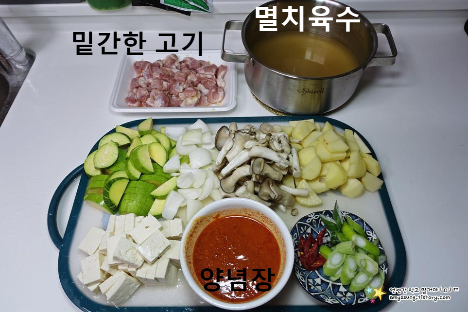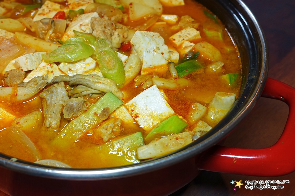 ▣ 주재료 : 돼지고기 앞다리살 400g, 두부 1모(1팩 = 300g), 애호박1개, 감자(주먹크기)2개, 양파(대)1/2개, 맛느타리버섯 2종이컵, 대파 10cm 한토막, 청양고추2개