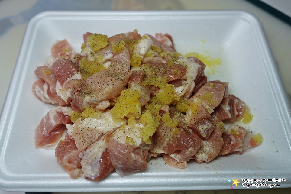 ▣ 돼지고기 밑간 재료 (밥숟가락) : 다진 마늘1, 소주2, 후추 3꼬집