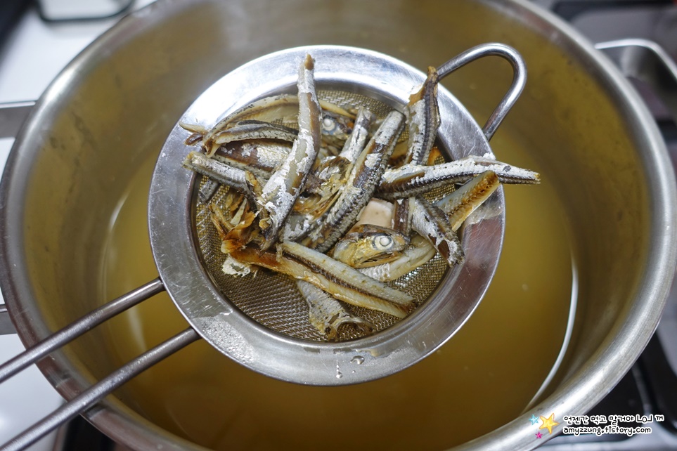 ▣ 밑국물 : 볶은 멸치에 물 1000ml 를 넣고 => 약불에서 끓이기 시작해서 => 팔팔 끓으면 그대로 10분간 더 끓이다가 => 건더기를 모두 건져주세요.