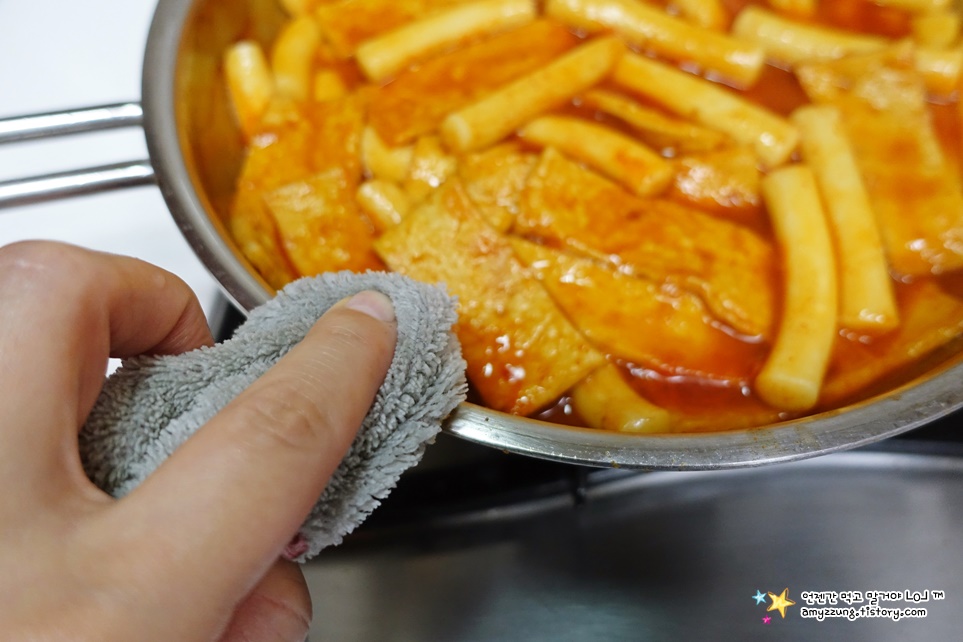 ▣ 여덟째 - 떡과 어묵이 말랑하게 익었다면 불을 끄고 => 팬 가장자리를 깔끔하게 닦아주세요.