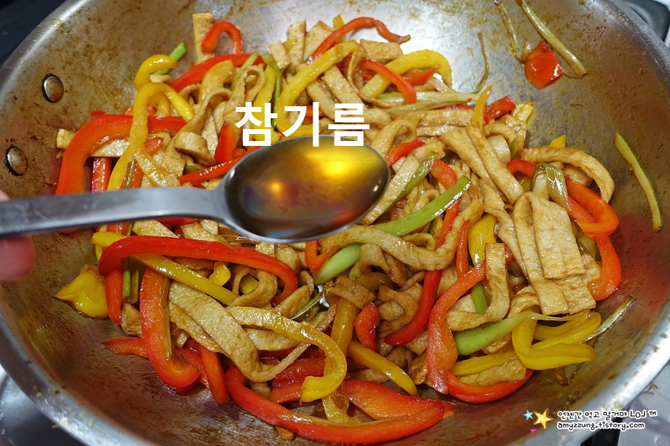 ▣ 셋째 - 파프리카 겉면에 간장색이 들었다면 => 어묵을 넣어 골고루 볶아주세요..