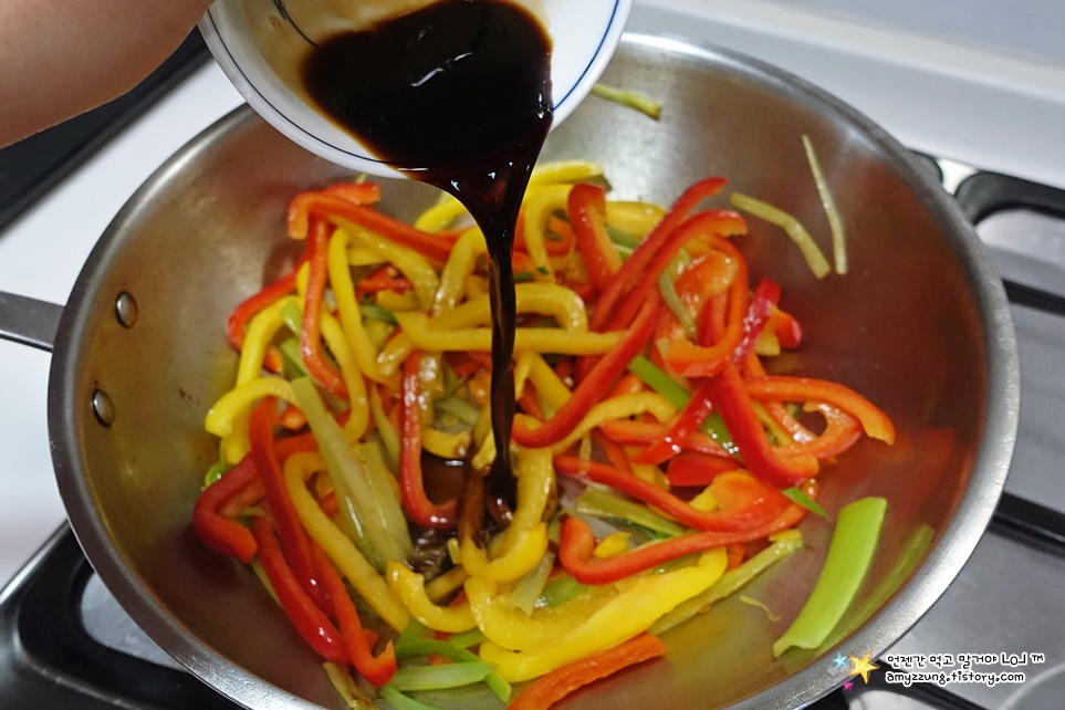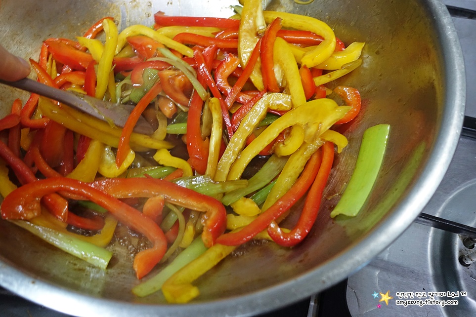 ▣ 둘째 - 대파가 익었다면 => 파프리카와 양념장을 넣고 골고루 볶아주세요.