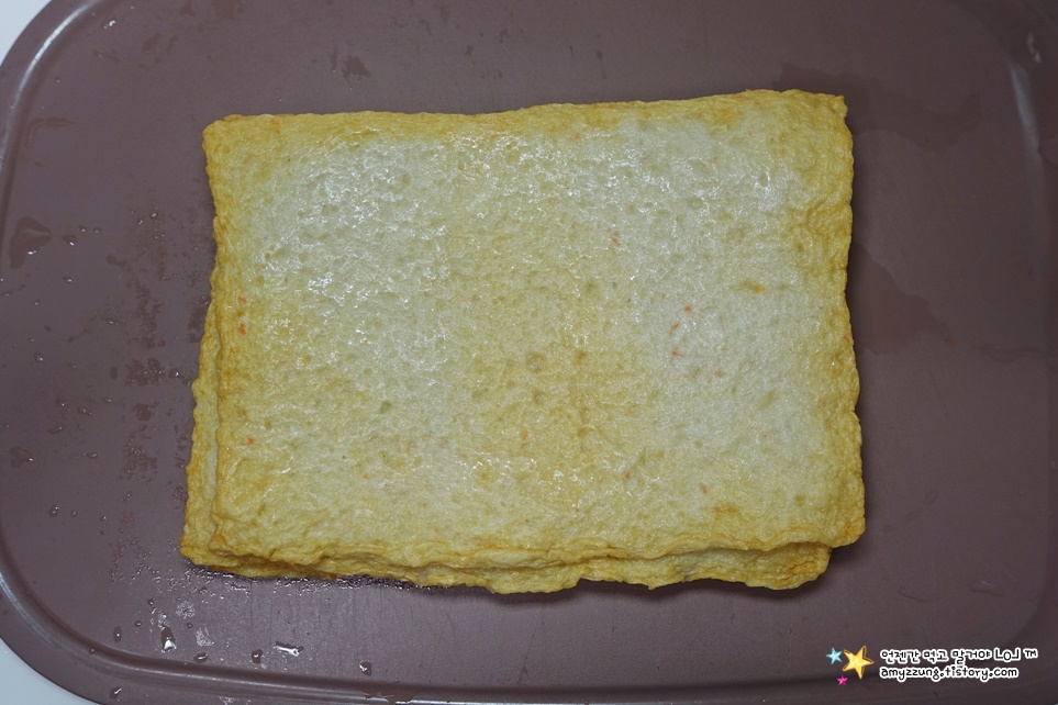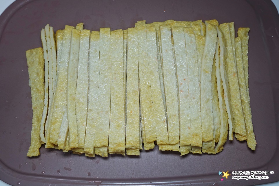▣ 납작어묵 : 가로로 놓고 0.5cm 두께로 채썰어주세요.