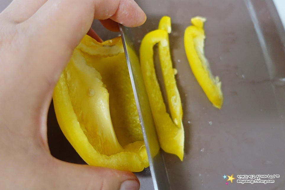▣ 파프리카 : 반으로 가른 후 => 꼭지와 씨앗을 손으로 떼어 낸 후 => 안쪽에서 0.5cm 두께로 채썰어주세요.