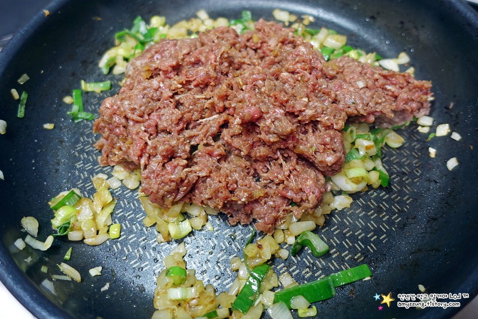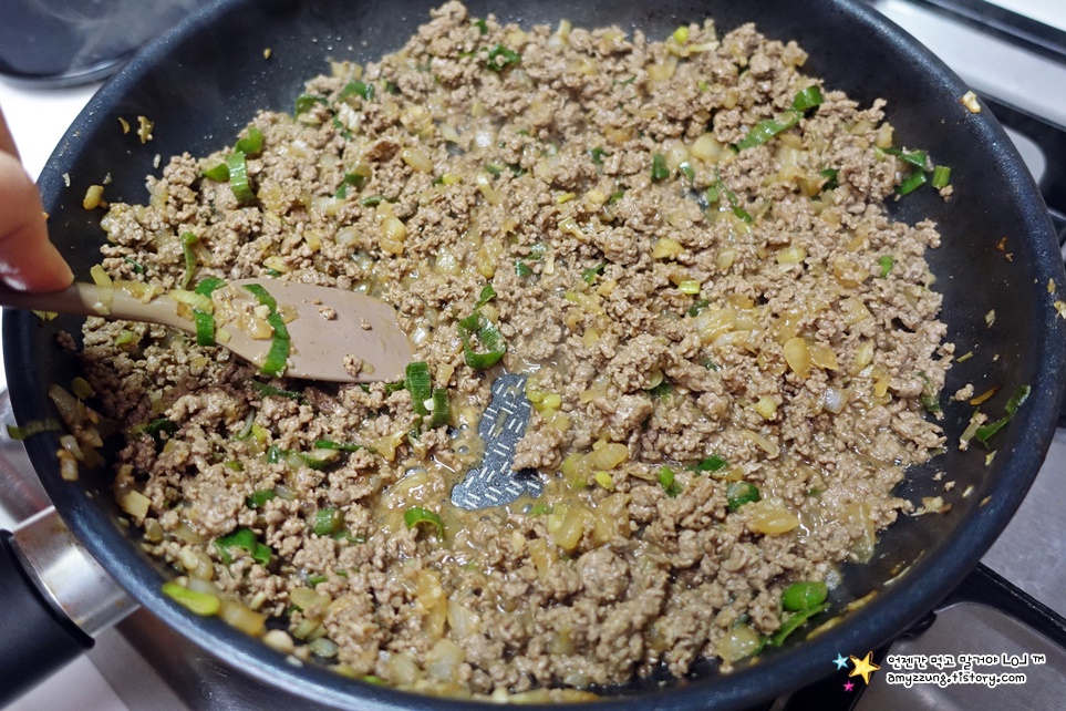 * 다짐육은 뭉쳐있으니 주걱으로 풀어주면서 볶아주세요.
