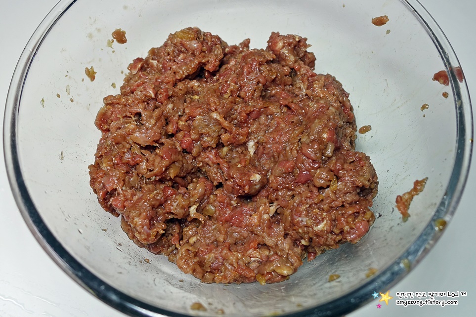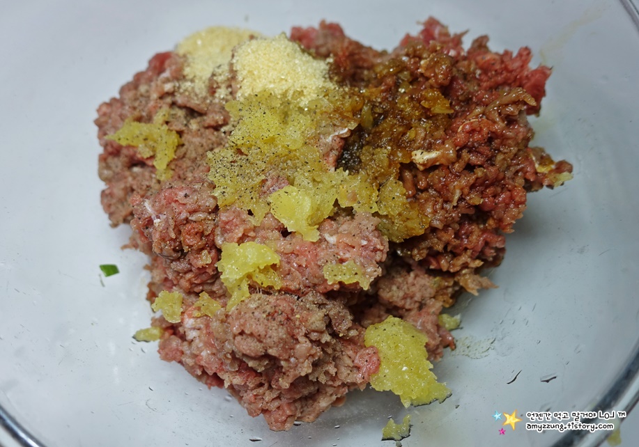 ▣ 소고기양념 : 다진 고기는 키친 타올로 눌러 핏물을 뺀 후 => 간장3, 설탕1, 다진마늘1, 소주2, 후추4꼬집을 넣고 골고루 무쳐주세요.