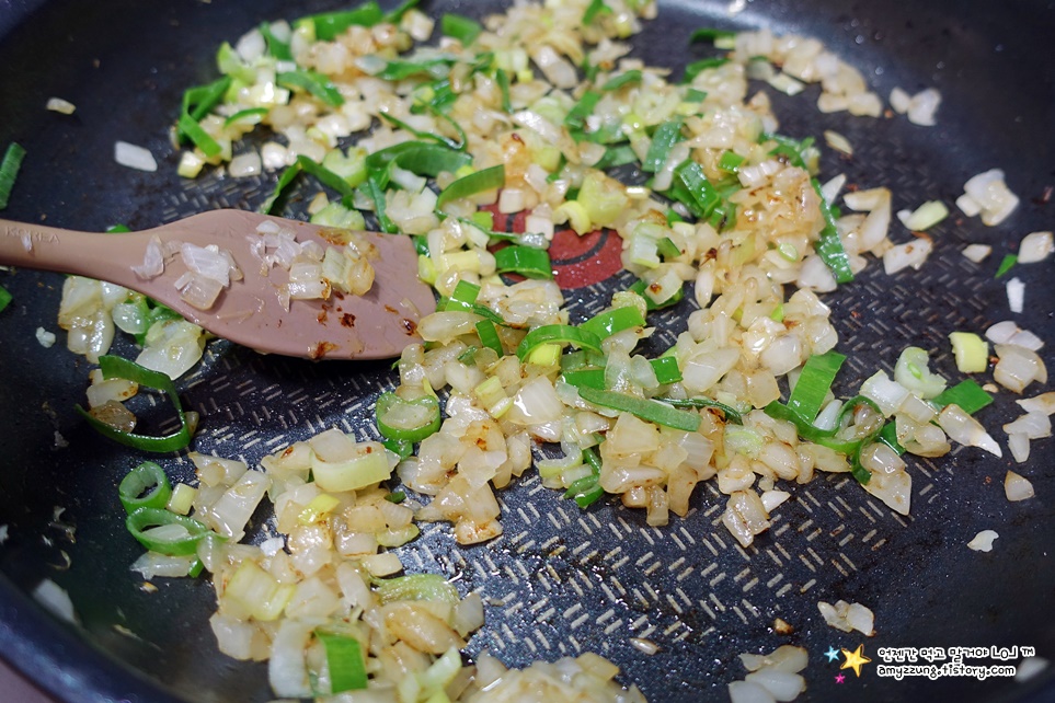 ▣ 둘째 - 볶은 양파에 식용유2, 대파를 넣고 볶아주세요.
