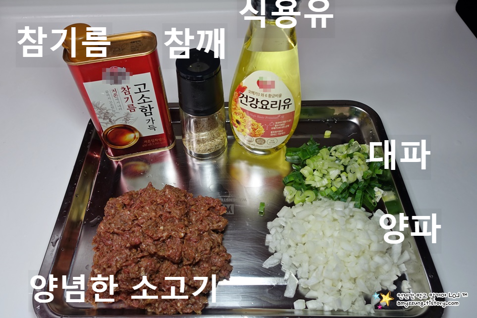 ▣ 주재료 : 소고기 다진 것 300g, 양파(큰것) 1/2개, 대파 20cm 한토막, 식용유 2밥숟가락.