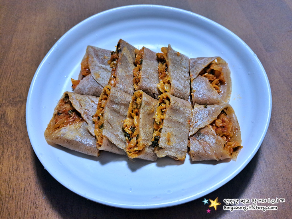 그냥 메밀가루 반죽에 볶은 김치만 넣어 돌돌 말은 부침개라서