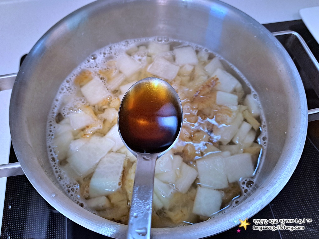 ▣ 둘째 - 국물이 팔팔 끓기시작하면 => 액젓2를 넣어 섞고 => 비린내가 날아가도록 뚜껑을 열고 끓여주세요.