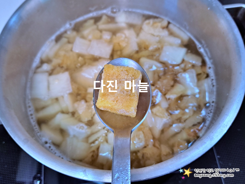 ▣ 넷째 - 마지막으로 다진마늘, 청양고추, 대파를 넣고 골고루 섞은 후 => 3~4분만 더 끓이고 불을 꺼주세요.